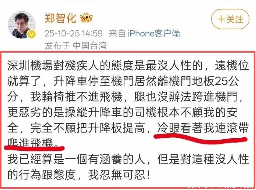 面对质疑,郑智化并未澄清或致歉,反而再次发帖,将矛头扩大至内地多个机场,抱怨安检对其金属支架的检查属于“恶意刁难”。他甚至流露出失望情绪,暗示可能退出公众视野。