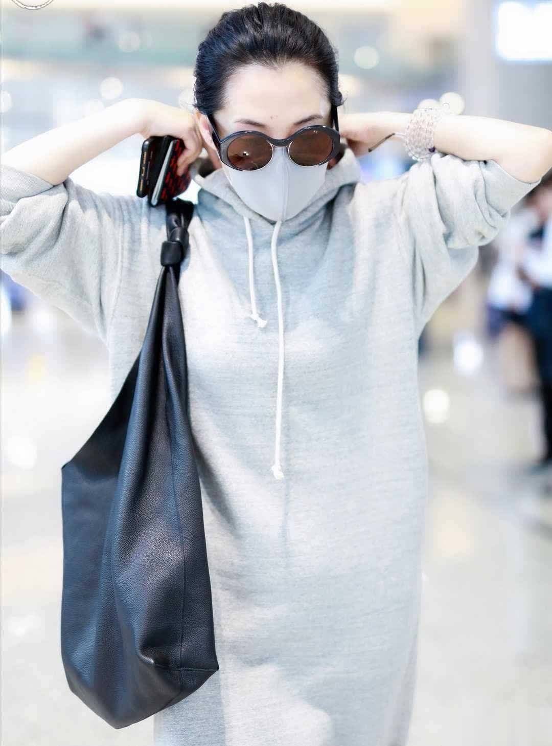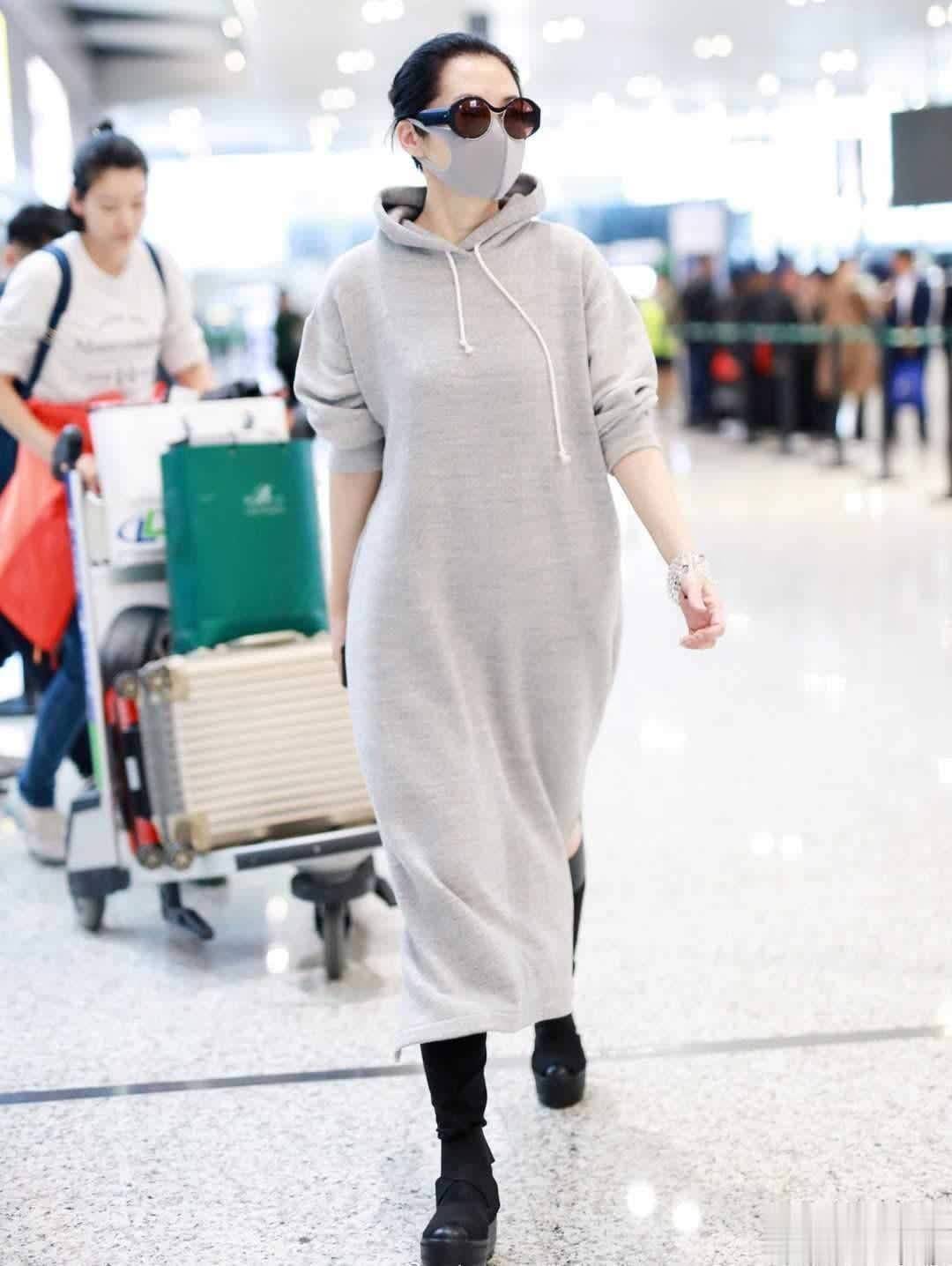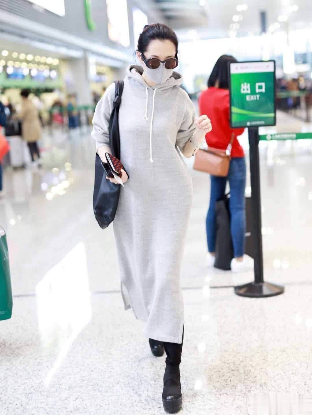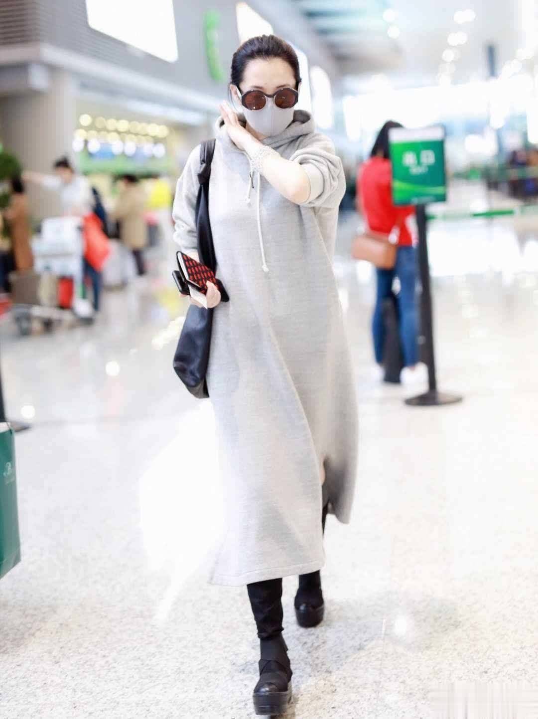 许晴任性穿卫衣裙长筒靴走机场,打扮似20岁小姑娘
